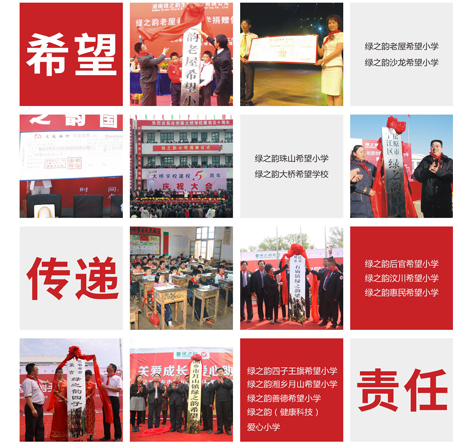 【具体内容】:捐助38所绿之韵希望学校是所有绿之韵人的夙愿。全国各地已先后有绿之韵沙龙希望小学、绿之韵珠山希望小学、绿之韵大桥希望学校、绿之韵后官希望小学诞生、绿之韵汶川希望小学、绿之韵惠民希望小学、绿之韵四子王旗希望小学、绿之韵湘乡月山希望学校、绿之韵(健康科技)凉山爱心小学等。2014年11月25日,安博官网获共青团中央、中国青少年发展基金会“希望工程25周年杰出贡献奖”。