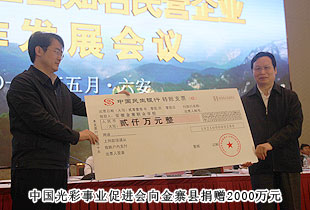 践行光彩精神,助力老区发展。2013年5月9日上午,由中国光彩事业促进会、中华全国工商业联合会与安徽省人民政府联合举办的“中国光彩事业六安行暨安徽省与全国知名民营企业合作发展会议”在安徽省六安市召开。本次大会旨在光大光彩事业、搭建合作平台,推进大别山片区扶贫攻坚,深化安徽与全国知名民营企业合作。会上,中国光彩事业促进会现场向金寨县捐赠2000万元,全省各地市与多家企业现场集中签约项目228个,投资规模3485亿元。