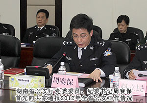 湖南省公安厅党委委员、纪委书记周赛保首先向大家通报了2012年全省公安工作情况,他指出,刚刚过去的2012年,是公安工作任务艰巨繁重的一年。全省公安机关和广大民警在省委、省政府和公安部的坚强领导下主动迎难而上,忠实履责,无私奉献,有力地维护了全省社会政治稳定和治安平稳。根据民调中心调查显示,2012年公众对社会治安、公安队伍建设的整体评价比2011年分别提升了2.196分、4.29分。警务调查显示,人民群众对警务工作的满意率达98.94%,受到了省委、省政府和公安部的充分肯定。