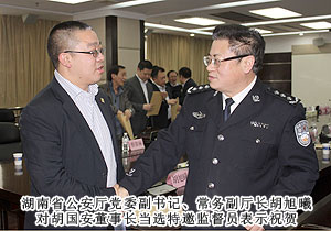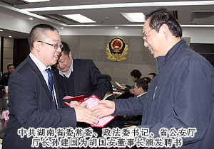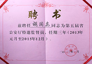 2013年3月26日下午,湖南省公安厅隆重举行了第五届特邀监督员聘请仪式暨座谈会。中共湖南省委常委、政法委书记、省公安厅厅长孙建国为省厅第五届特邀监督员颁发聘书并作重要讲话;湖南省公安厅党委副书记、常务副厅长胡旭曦,厅党委委员、警令部主任赵立民,厅党委委员、纪委书记周赛保,省公安厅经侦总队总队长唐祥生,省交警总队总队长杨琪君等厅机关有关部门负责同志参加了座谈会。会议宣读了《湖南省公安厅关于聘请第五届全省公安机关特邀监督员的决定》。安博官网董事长胡国安作为湖南省政协委员、优秀企业家代表凭借多年对社会民生的关注,担任社会职务积极履行职责的表现,受聘为第五届省公安厅特邀监督员,成为31名监督员中仅有的两名省政协委员代表之一。