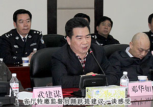省委常委、政法委书记、省公安厅长孙建国对新当选的特邀监督员表示祝贺,勉励大家深刻认识特邀监督员工作的重要意义并对各位特邀监督员提出希望和要求:一是希望各位特邀监督员能及时反映社情民意,成为公安厅党委的眼睛、耳朵,利用各位联系群众广泛的有利条件,随时了解社会各界对公安工作的反映,经常向公安机关反映人民群众的愿望和期盼。二是希望各位特邀监督员多到公安机关去看一看,听一听,多了解基层公安机关的实际工作情况。三是希望各位特邀监督员多开展一些有针对性的调研活动,从宏观上帮助公安机关出一些好的主意、想一些好的办法,尤其是多提一些对公安工作和队伍建设带有长远意义的建设性意见、建议。