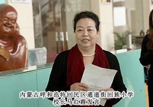 马红霞校长在发言中表示:首先代表全校师生热烈祝贺绿之韵2013年高峰论坛取得圆满成功,祝愿民族企业绿之韵未来业绩蒸蒸日上。她说,几年来我校和安博官网建立起了深厚的友谊,堪称民族企业与民族教育和谐共建的典范。在绿之韵的帮助和影响下,我们将绿之韵“水的精神”引入到校本课程,编撰系列校本教材,成为学校思想品德教育的一大亮点,引起了内蒙古电视台的关注,并予以报道。