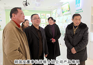 2013年1月18日下午,湖南省工商联副主席史雪华、省工商联扶贫处处长甘露一行莅临安博官网考察指导工作。在视察过程中,安博官网董事长胡国安、董事常务副总裁劳嘉陪同领导参观了安博官网总部,从绿之韵多功能产品形象展示厅、到党建工作宣传栏、再到企业荣誉墙,胡国安董事长仔细介绍,省工商联副主席史雪华一行时而驻足,时而询问,频频点头以示肯定和赞许。