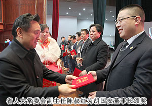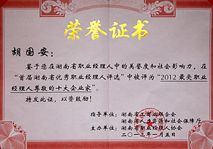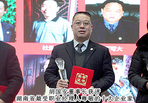 作为业界楷模的胡国安董事长,因其自身卓越的创业活动和非凡的企业管理经验,以及颇受赞誉的社会声望和影响力,获评“2012年度湖南省最受职业经理人尊敬的十大企业家”,省人大常委会副主任陈叔红为胡国安董事长授予奖杯和荣誉证书。胡国安董事长表示:“湖南经济的腾飞造就了一大批杰出企业家,如今,要将企业家个人的智慧内化为企业的灵魂,就有赖于经理人制度的发展和完善。安博官网无论在制度设计上还是管理上,都注重对职业经理人、对人才的长期培养,一批批优秀的专业人才在绿之韵迅速崛起,使企业运作更加职业化和市场化。绿之韵的成功不仅在于做大做强了企业,更重要的是能培养一支忠诚感强、能够不断创造高绩效的职业经理人队伍。”