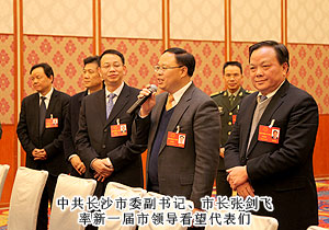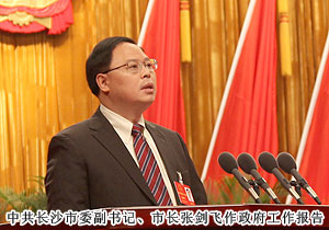 长沙市人大常委会主任余合泉主持会议并宣布大会开幕。在热烈的掌声中,中共长沙市委副书记、市长张剑飞首先作政府工作报告,描绘了未来5年长沙的四个发展目标:建设经济繁荣、活力迸发的现代中心城市;两型引领、环境优美的生态宜居之都;开放包容、美丽独立的国际文化名城;生活富足、社会公平的和谐幸福家园。张市长说,过去五年,在市委的坚强领导下,我们以科学发展观为统领,抢抓中部崛起和“两型社会”建设的战略机遇,科学应对国际金融危机的严峻挑战,成功抗击历史罕见的雨雪冰冻灾害,推进创业之都、宜居城市、幸福家园建设,圆满完成了市第十三届人民代表大会第一次会议以来确定的各项目标任务。2012年,全市地区生产总值达6510亿元,年均增长14.6%,经济总量居省会城市第7位,五年前进了5位;城市综合竞争力由第24位跃升到第10位,进入全国十强、全球十快。我们必须认真贯彻落实党的十八大精神,按照市第十二次党代会确定的“城市国际化、产业高端化、城乡一体化、发展两型化、管理法治化,率先建成两型城市和实现全面小康”的战略目标,着力转变发展方式、推动改革创新、提升城市品质、推进城乡一体、创新社会管理、保障改善民生,努力建设更加富裕、秀美、文明、幸福的大长沙。