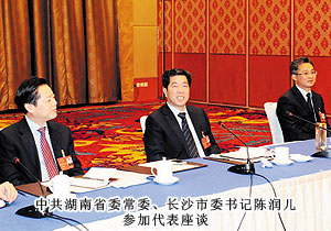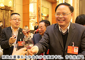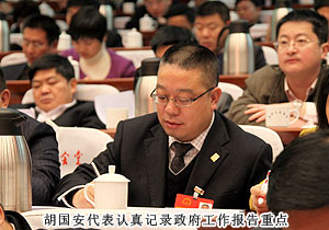 “今天聆听了政府工作报告,报告内容凝练。每个数字都有力地彰显出长沙发展的速度,令我感到十分振奋。”胡国安代表在接受长沙新闻频道记者采访中表示。开幕式后,省委常委、市委书记陈润儿,市委副书记、市长张剑飞一行来到各地区代表团,与出席市十四届人大一次会议的代表们一起审议政府工作报告,听取代表们的建议和意见。感受身边的巨变,畅谈过去五年的成绩,代表们一致认为报告分析形势客观到位,总结成绩实事求是。报告主题突出,高屋建瓴,准确的数字具有很强的说服力,具体的目标体现着政府求真务实的作风,清晰的思路昭示着长沙的美好未来。会上,就2013年长沙经济社会如何保持平稳快速发展,代表们纷纷献计献策。陈润儿书记、张剑飞市长分别带领长沙市领导成员与委员们共同协商讨论,仔细倾听每位代表发言,认真记录,还不时一起探讨。作为长沙国家生物产业园代表,胡国安代表在分组报告中对园区2012年取得的成绩作了详细汇报。并提出“加快四化两型建设,以非公经济促进城乡一体化进程,加大对实体经济支持力度,践行实业强市、实业强省、实业强国之路”的建议。同时,针对政府报告中提到的:建设生态长沙、精美长沙,推进“沿江建设、跨江发展”,以及积极推进以浏阳河九道湾为品牌;完善湘江生态经济带,打造“浏阳河九道湾”品牌,规划改造捞刀河、沩水河、靳江河、圭塘河风光带等宜居都市的政府规划,胡国安代表结合园区、安博官网实际,详尽阐述了安博官网的绿色经济发展思路,以及在浏阳河与捞刀河畔建立生态休闲区、建立五星级生态酒店、别墅群等未来发展规划。陈润儿书记认真聆听胡国安代表的发言,边听边记,对发言中提及的思路和建议表示高度的肯定。陈书记在胡国安代表发言后说,党的“十八大”将城乡一体化与实业兴国作为重点工作,我们要大胆推进改革,释放发展活力,政府的权力要归位,服务要到位,进一步加大对实体经济发展的支持力度。