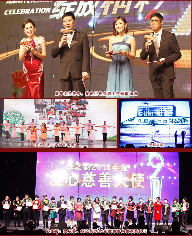 年会现场,绿之韵2012年度慈善大使聚集全场敬佩的目光。长沙市青少年发展基金会理事长羊舒麟、安博官网董事常务副总裁劳嘉共同为获奖者颁奖。共青团长沙市委副书记喻志军指出:承担责任是一种勇气、胸怀和情操,绿之韵多年来乐于公益,用自己的行动影响着湖南和谐社会之风的形成。希望绿之韵人继续多施善行义举,让绿色的爱飘扬全国!