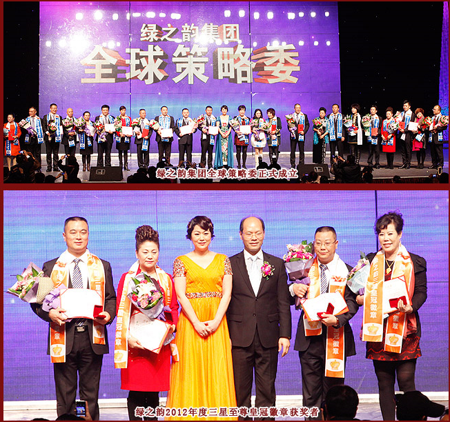 绿之韵2012年度豪华奔驰轿车奖、至尊皇冠奖、忠诚奖、最具成长奖、绿韵之星奖,在绿之韵九周年盛典上,年度最闪亮的明星一一登上荣耀的舞台,接受至高无上的表彰。他们,凭借着坚定的信念、执着的追求和不懈的努力,在绿之韵全球最佳事业平台上实现了个人的梦想;他们是伙伴的榜样,始终保持着冲锋者的姿态,在销售前沿亮出自己的风采,在市场搏击中创造骄人的业绩;他们是绿之韵最值得尊敬的人,帮助每一位营销伙伴都能在绿之韵实现自己的梦想,用智慧和力量创造奇迹,为绿之韵创造跨越式发展的空间。
