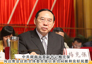 开幕式前,中共湖南省委书记、省人大常委会主任周强,湖南省人民政府省长徐守盛,中共湖南省委副书记梅克保,中共湖南省委常委、省军区政委李有新,中共湖南省委常委、省委秘书长易炼红,湖南省人大常委会副主任陈叔红,省政府副省长韩永文,省政协副主席王晓琴等领导亲切接见全体青联委员并合影留念。省委副书记梅克保出席开幕式并做重要讲话。梅克保指出,实践证明,当代湖南青年是值得信赖、堪当重任、大有希望的一代。今后五年,是我省全面建设小康社会、加快推进现代化进程的关键时期。省第十次党代会科学描绘了湖南未来五年改革发展的宏伟蓝图,提出了“四化两型”的总战略和“两个加快、两个率先”的总任务。实现这一目标任务是全省人民的共同心愿,也需要全省人民团结一心、奋力拼搏。我省青年作为其中最富朝气最具前途的重要群体,更是义不容辞、责无旁贷。