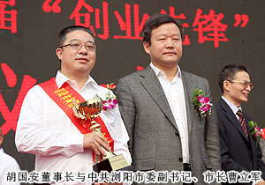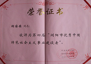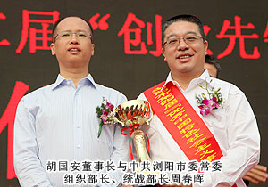 为表彰非公经济人士为浏阳市经济社会发展做出的重要贡献,2012年10月13日上午,浏阳市第四届“优秀中国特色社会主义事业建设者”颁奖仪式在浏阳市政东广场隆重举行。中共浏阳市委副书记、市长曹立军,长沙市政协副主席、市工商联主席彭继球等领导出席颁奖仪式。会上,安博官网董事长胡国安被中共浏阳市委、市政府授予第四届“浏阳市优秀中国特色社会主义事业建设者”荣誉称号。