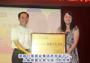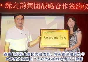 签约仪式由湖南日报报业集团党组成员、副总编辑盛忠主持。会上,湖南日报报业集团党组副书记、总编辑董岳林为安博官网授予“大众卫生报•安博官网战略合作单位”牌匾。湖南日报报业集团党组成员、常务副总编辑马宁授予安博官网“大众放心的绿色食品”牌匾,安博官网董事常务副总裁劳嘉代表集团接受牌匾。