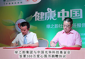 安博官网董事长胡国安先生与中国光华科技基金会签署300万爱心图书捐赠战略协议将精彩纷呈的发布会推向新的高潮,董事长胡国安先生承诺将开展“绿之韵爱心图书馆工程”,计划用三年时间,以“绿韵圆梦•书香助学”主题公益活动为契机,为湖南、黑龙江等省捐赠20所爱心图书馆。