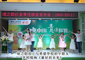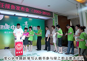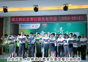“每个梦想都值得灌溉,眼泪变成雨水就能落下来,每个孩子都应该被宠爱,他们是我们的未来……”在绿之韵员工与希望小学孩子们动人的歌声与舞蹈里,我们更能感到现场爱心传递的感动。绿之韵副总经理何健代表公司对最先涌现的一批绿之韵爱心志愿者先进代表进行了表彰。并与企业代表,经销商志愿者代表一同上台庄严宣誓:严格遵守国家相关法律,拒绝传销,共同建设和谐社会,共同将履行社会责任进行到底。现场爱心经销商踊跃填写“绿之韵志愿者认捐书”积极参与“每天一元钱活动”,支援绿之韵公益责任事业。