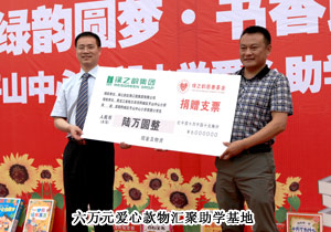 2012年6月25日,绿之韵黑龙江分公司“绿韵圆梦•书香助学”活动暨绿之韵平山中心小学爱心助学基地授牌仪式成功举行。为了给渴望知识的孩子们创造更好的读书环境,活动当天,绿之韵黑龙江地区近100名优秀经销商将爱心图书亲手送到了学生手中,同时,安博官网东北区域业务总监李定代表绿之韵慈善基金向爱心助学基地捐赠6万元款物,标志着绿之韵第二家校园爱心“流动图书馆”正式成立。