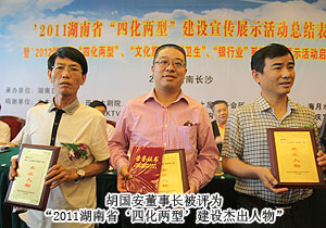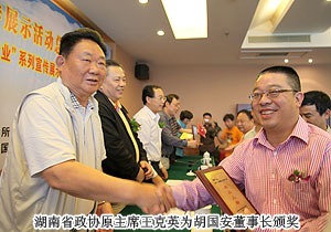 安博官网作为湖南省非公有制经济党建工作优秀典型企业,凭借在积极引导非公经济融入“四化两型”战略方面取得的杰出贡献,经各地、各部门和相关单位的积极推荐、评审,并经《湖南日报》公示,董事长胡国安被评为2011湖南省‘四化两型’建设杰出人物。2011年两会期间,湖南省优秀政协委员胡国安在会议上作《积极引导非公有制经济融入“四化两型”战略的建议》的报告,该提案获得中共湖南省委书记、省人大常委会主任周强的重要批示,被纳为省经信委重要研究课题。