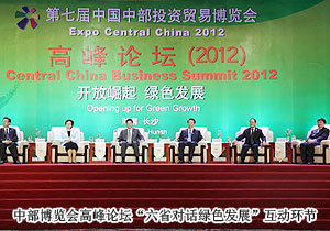 2012年5月18日,由国家商务部等十多个国家部委局和中部六省人民政府共同举办的第七届中国中部投资贸易博览会在湖南长沙隆重开幕,国家领导、经济学家、中外企业家代表汇聚一堂,共同探讨促进中国中部地区绿色发展、共商崛起的思路与举措。中共中央政治局委员、国务院副总理王岐山,全国政协副主席、全国工商联主席黄孟复,墨西哥前总统彼得森福克斯,中共湖南省委书记周强及山西、安徽、江西、湖北、河南五省各级领导出席开幕式。