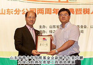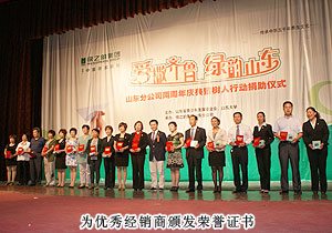 绿之韵执行总经理龚振发表致辞,代表安博官网对山东分公司两周年庆典表示衷心祝贺,感谢对多年来山东地区绿之韵伙伴与山东分公司风雨同舟、和衷共济,并将5万元爱心款物捐赠给山东省青少年发展基金会副秘书长姜大鹏。姜秘书长也回赠安博官网希望工程捐助牌匾,同时向绿之韵爱心经销商颁发了象征慈善与爱心的捐助证书。10位获资助的大学生深深鞠躬表达心中的感谢,一曲感恩的心使整个会场笼罩了一层爱的光芒。