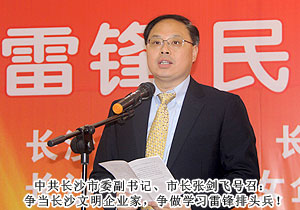 中共长沙市委副书记、市长张剑飞在会上表示,希望广大工商界人士、女企业家要切实增强历史使命感和发展紧迫感,争当长沙文明企业家,争做学习雷锋排头兵,以雷锋为榜样,自觉地把个人发展与全市经济社会发展结合起来,把个人富裕与全市人民共同富裕结合起来,坚定信心,抢抓机遇,乘势而上,以实际行动促进我市非公有制经济蓬勃发展,开创我市工商界人士学习雷锋精神的崭新篇章。同时,张剑飞要求全市工商界人士要学习雷锋同志的实干精神,抢抓机遇,加快企业转型升级;要学习雷锋同志的“钉子”精神,刻苦学习,不断提升自身素质;要学习雷锋同志的“傻子”精神,努力奉献,积极承担社会责任。