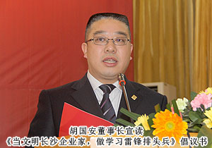 本次会议中,安博官网董事长胡国安代表长沙市工商联参会企业家向广大非公经济人士发出了《当文明长沙企业家,做学习雷锋排头兵》倡议书。积极号召广大民营企业家:学习雷锋理想远大、信念坚定,做一个忠诚于党、热爱人民的人;学习雷锋刻苦钻研、敬业奉献,做一个与时俱进、爱岗敬业的人;学习雷锋言行一致、诚信老实,做一个诚实守信、求真务实的人;学习雷锋勤俭节约、艰苦奋斗,做一个艰苦朴素、道德高尚的人。