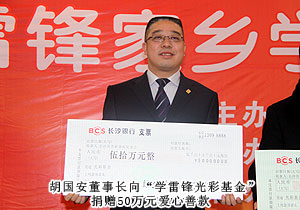 2012年2月29日,在“3•5”学习雷锋纪念日即将到来之际,由湖南省工商联、长沙市工商联共同发起的“雷锋家乡学雷锋、民营企业当先锋”——省会工商界人士学雷锋庆三八大会在长沙枫林宾馆拉开帷幕,吹响了湖南省会工商界争当学雷锋先锋的集结号。中共长沙市委副书记、市长张剑飞,中共长沙市委常委、市委统战部部长文树勋出席会议。会上,湖南省工商联(总商会)常委、长沙市工商联(总商会)副会长、优秀民营企业家、安博官网董事长胡国安代表绿之韵慈善基金以实际行动为湖南省光彩事业增光添彩,向“学雷锋光彩基金”捐赠50万元爱心善款。