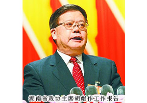 受政协湖南省第十届委员会常务委员会的委托,湖南省政协主席胡彪向大会作了工作报告。报告从6个方面回顾总结了一年来我省政协工作取得的主要成绩:认真学习贯彻中央和省委重要精神;政治协商程序化进一步推进;参政议政成效进一步显现;民主监督组织化程度进一步提高;爱国统一战线进一步巩固;政协工作科学化水平进一步提升。