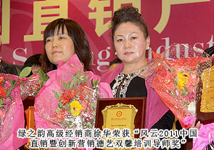 本次论坛对2011年中国直销行业进行了总结表彰,安博官网荣获“中国直销行业社会责任公益项目创新奖”“风云2011中国直销暨创新营销行业规范运作奖”;绿之韵韵宜生系列产品被评为“风云2011中国直销暨创新营销行业最受消费者欢迎产品”;安博官网董事长胡国安荣获“中国直销行业社会责任功勋人物”荣誉称号;安博官网董事常务副总裁劳嘉荣获“中国直销行业社会责任卓越人物”荣誉称号;安博官网总裁助理兼企划教育总监何健荣获“风云2011中国直销暨创新营销行业杰出管理人物”荣誉称号;绿之韵高级经销商徐华、曹凤华荣获“风云2011中国直销暨创新营销德艺双馨培训导师奖”;绿之韵华易联盟、华晨系统荣获“风云2011中国直销最具影响力品牌系统奖”; 绿之韵低碳事业部总裁戴嵘、副总裁张晋崧分别荣获“风云2011中国直销暨创新营销行业魅力女性奖”和“风云2011中国直销暨创新营销德艺双馨培训导师奖” ;绿之韵优秀经销商平刚、张久朋荣获“风云2011中国营销最具影响力品牌领袖奖”。