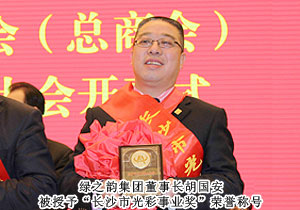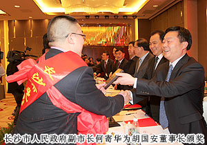 2011年12月23日,长沙市工商联(总商会)第十三次会员代表大会在长沙隆重召开。中共湖南省委常委、长沙市委书记陈润儿,中共长沙市委副书记、市长张剑飞,中共长沙市委常委、市委统战部部长文树勋,湖南省委统战部副部长、省工商联党组书记崔永平等省市各级领导出席会议。作为长沙市工商联(总商会)副主席,安博官网董事长胡国安凭借多年来率领企业积极响应并参与 “万企联村、共同发展”、情系“三区”,感恩社会光彩大行动等活动取得的成绩,荣获由长沙市委统战部、市工商联联合颁发的“长沙市光彩事业奖”。