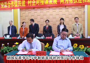 2011年10月16日,由中共湖南省委统战部、长沙市工商联举办的“党派合作促共建,村企对接谋发展,两为帮扶建和谐”签约仪式在浏阳革命老区——胡耀邦总书记故里中和镇召开。中共湖南省委统战部副部长唐建、长沙市政协副主席、民建长沙市委主委段安娜、长沙市政协副主席、市工商联主席彭继球、中共长沙市委统战部常务副部长刘应群等出席签约仪式。安博官网董事长胡国安作为长沙市工商联副主席积极参与“村企对接工作”与浏阳市中和镇签订村企对接签约,规划在当地建设2000亩紫锥菊、芦荟、黄芪中药材基地。据悉,这是安博官网“万企联村”万亩中药材基地建设项目继益阳、郴州之后第三个选址点。