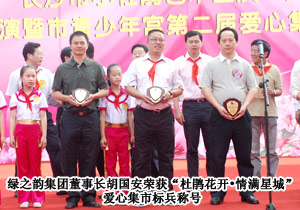 为庆祝“六一”国际儿童节的到来,2011年5月28日,由长沙市委组织部、市委宣传部、市文明办、团市委、市少工委、市教育局联合举办的“杜鹃花开•情满星城”小杜鹃艺术团庆“六一”文艺义演暨市青少年宫第二届爱心集市大型公益活动,在长沙市青少年宫举行。各级政府领导以及社会各界的1000多名爱心人士与全市各区县(市)近200名残疾儿童、孤儿、困难家庭子女、农村留守儿童、农民工子女共同庆祝属于孩子们的欢乐节日。安博官网董事长胡国安作为长沙市优秀青年企业家代表受邀出席活动,并荣获“杜鹃花开•情满星城”爱心集市标兵荣誉奖牌。