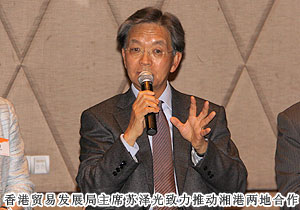 苏泽光主席表示,最近,湖南在香港很“热”,越来越多的港企来到湖南投资。香港贸发局将进一步发挥窗口和桥梁作用,推动湘港两地在现代服务业、创意产业等领域深化合作,帮助湘企借助香港平台走向世界。