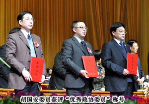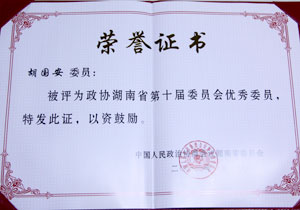 根据《关于湖南省政协委员履行职责的办法(试行)》“在每一届政协的第三、第五年,按照委员总数的8%评选优秀政协委员”的要求,省政协将在年底评选优秀省政协委员。优秀省政协委员评选条件为:积极主动参加政协活动,并在其中起骨干作用;履行职责成果显著,建言献策转化率高;为地方经济社会发展作出的贡献较大。评选采取量化的办法,依据政协职能和委员职责,设置了参加政协例会情况、撰写提案及办理情况、社情民意采用及转化情况、参加调研情况等9个计分项目。担任政协委员期间,胡国安委员先后提交了《我省民企应对金融危机的对策及建议》《关于下调武广高铁票价》等多份关系经济发展及社会民生的提案,并多次深入一线调研,实实在在了解民众,及时提出建议,最终获评“优秀政协委员”荣誉称号。湖南卫视、湖南经视、红网、《潇湘晨报》《长沙晚报》《人民政协报》等多家权威媒体对胡国安委员的先进事迹进行了报道!