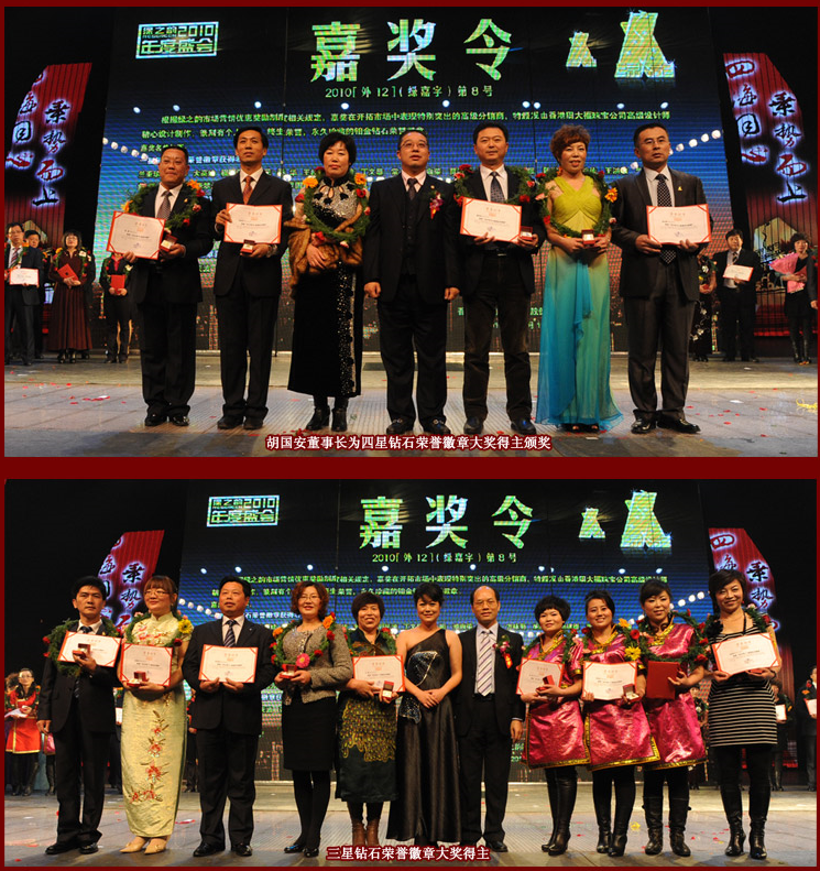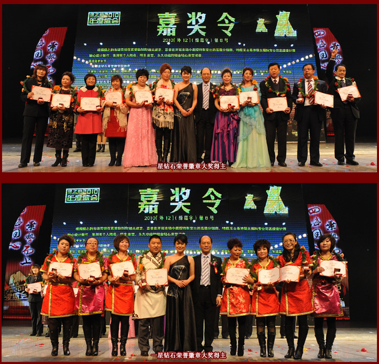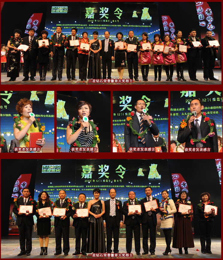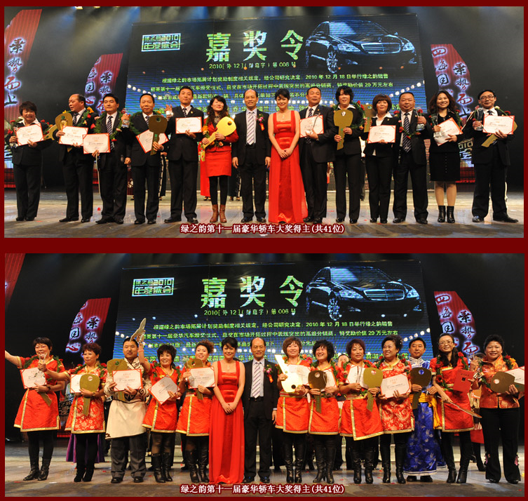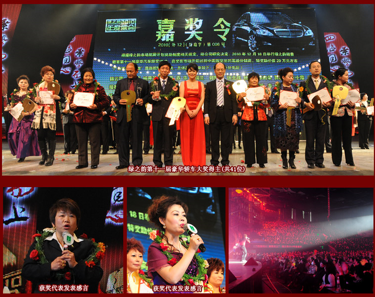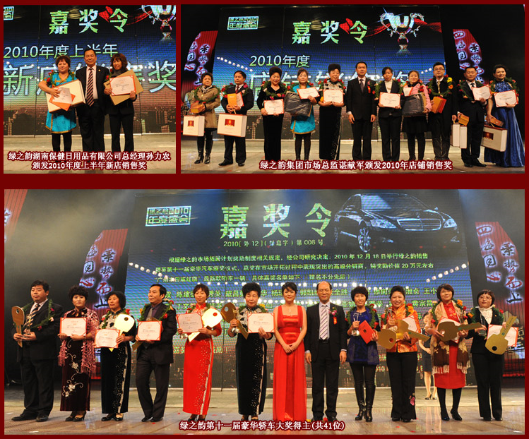 在星光闪耀、荣光无限的年会颁奖舞台,曾经含泪播种的英雄,此刻含笑收获。2010年度星级钻石荣誉徽章大奖、2010年度豪华轿车大奖、2010年店铺销售奖、2010年度上半年新店销售奖,每一项荣誉都是曾经努力奋斗的佐证。他们,在开拓中崛起,在坚持中壮大,奔跑的脚步从未停歇,在他们的感言分享中,我们可以见证绿之韵人逐梦的力量,感受梦想实现的喜悦与感动。