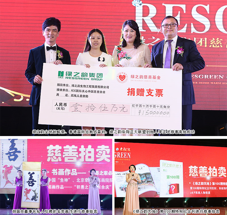 慈善拍卖,所得款项全部捐给国际关心中国慈善协会(简称ICC),是本次慈善名流晚宴的一大亮点。晚宴上,胡国安董事长慷慨捐出私人珍藏的当代著名书画家陈洪作品《积善之家必有鱼庆》进行慈善拍卖,被绿之韵全球战略委、善德国际总裁吕雷钧以7万元拍得;现场慈善拍卖的《绿之韵天地》第100期特别纪念刊拉封及团队系统报道版面成为本次活动的焦点,莅临出席晚宴的绿之韵家人们纷纷慷慨解囊、踊跃参加慈善竞拍。“5000元、20000元、68000元、80000元……”现场的爱心举牌竞拍叫价,此起彼伏,爱心浓烈。最终,这项拍品以8万元被绿之韵华翔系统正大联盟创始人李正元拍得。