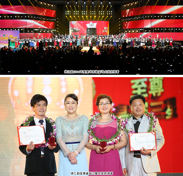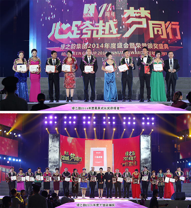 绿之韵2014年度十佳店铺奖:卫同俊、秦慧、李加勇、唐新华、黄普江、李付明、黄付初、朱彩君、谭爱玲、孙文祥、陈颖、向万才、苗水芝、高原、魏哲红、雷继佩、李爱华、崔世茹、王敬民、温妮荣获该奖项。绿之韵全球战略委吕秀玲,绿之韵国际商学院执行院长孙心琥颁奖,并致以祝贺。
