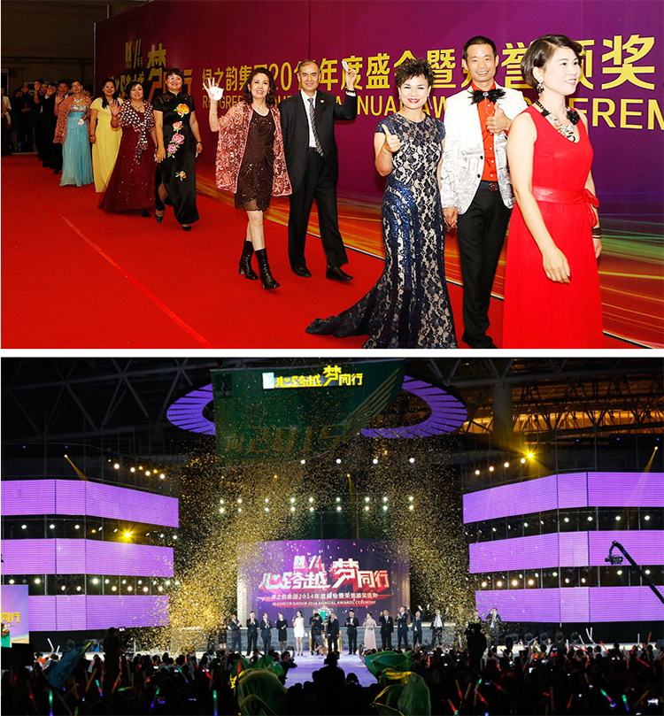 万人盛典,欢歌融聚;恢弘巨制,辉耀星汉。气势恢宏的湖南国际会展中心,“心跨越,梦同行”安博官网2014年度盛会暨荣誉颁奖盛典会场,斥资千万、中部最顶级、最豪华会展中心舞台流光溢彩、磅礴大气,许美静、郑智化、雪狼等众多巨星大腕载梦而歌,周华健、汪峰、凤凰传奇等明星大咖秀激情同庆。绿之韵用最具震撼力的视听盛宴,热情迎接大江南北绿之韵家人的归来,震撼开启十一周年庆典心梦之旅。