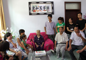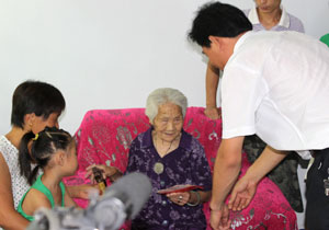 经叶县D8358店李增伟经理多次奔走联系,2010年8月13日,绿之韵寻找百位百岁老人活动小组联合叶县县委宣传部、叶县电视台一起对叶县遵化店镇代庄村95岁的张梅老人进行了慰问,在送上公司诚挚祝福的同时,也将慰问金和公司健康产品银杏螺旋藻礼盒装送到老人手里。