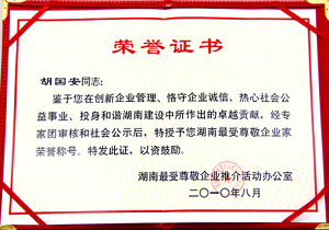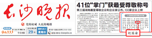 2010年8月28日,由湖南省科技厅、湖南省国家税务局、湖南企业发展调研办公室、湖南发展研究中心等单位联合举办的"第三届湖南最受尊敬企业推介"颁奖盛典暨新闻通报会在湖南蓉园宾馆举行。湖南省人大常委会党组成员、省政府顾问唐之享、原湖南省委书记熊清泉、原湖南省政协主席刘夫生等老领导出席本次颁奖活动。《湖南日报》、《潇湘晨报》、红网、长沙新闻频道等多家媒体对本次评选给予高度关注。安博官网荣获“湖南最受尊敬企业”荣誉称号,胡国安董事长被授予“湖南最受尊敬企业家”荣誉称号。