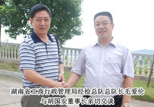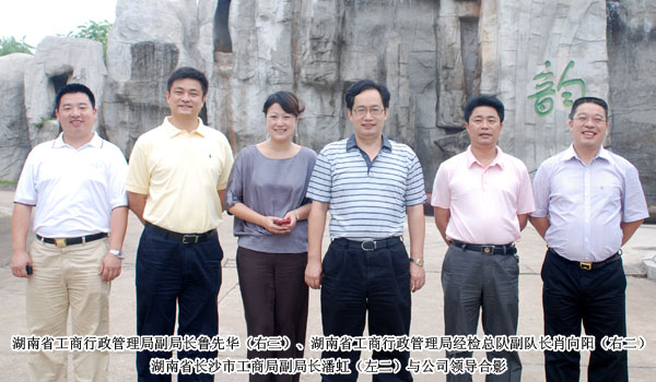 2010年8月1日,湖南省工商行政管理局副局长鲁先华、湖南省工商行政管理局经检总队总队长毛爱伦、湖南省工商行政管理局经检总队副队长肖向阳、湖南长沙市工商局副局长潘虹、湖南省长沙市工商局公平交易分局局长陈林一行莅临安博官网指导工作。安博官网董事长胡国安、董事常务副总经理劳嘉全程陪同。
