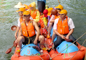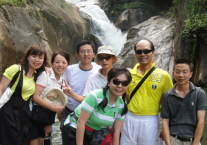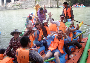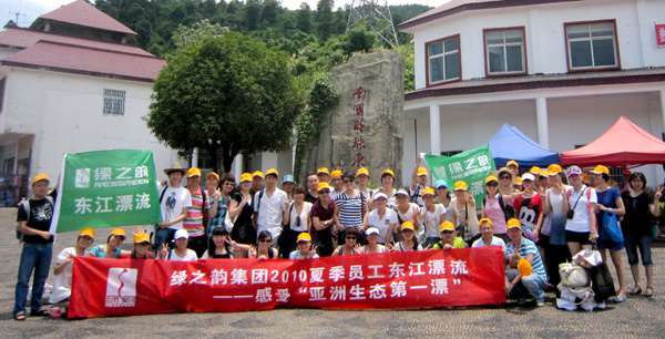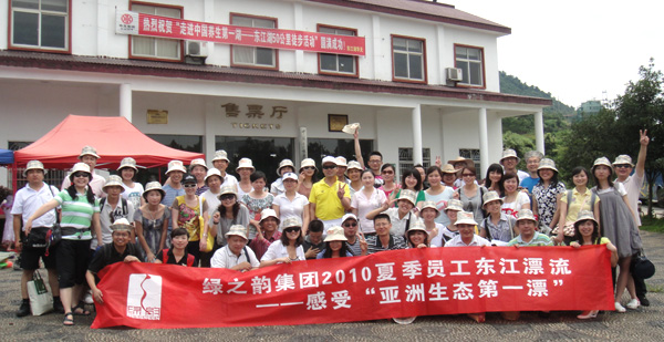旅游途中,不仅参观了雾漫小东江、猴古山瀑布、东江大坝等景点,大伙也尝到了东江湖特产的各色美味,在美丽的景色前争相合影,把绿之韵人的快乐和轻松留在了他乡。此次旅游的目的地东江漂流是最刺激的项目(全长28公里,落差75米,途经108个急险滩),同事们积极购置了水枪、水瓢、水盆、雨衣等备战工具,当大家到达起漂点,边穿救生衣边泼水,一场激烈的水战在此起彼伏的尖叫和欢笑声中拉开序幕。顺流而下,河段两岸青山叠翠,珍稀花草争妍斗艳,原始森林相拥对峙,怪石林立,水质清澈,给人以探幽、猎奇、拾趣之乐,同事们尽情地领略着博浪飞舟的激越、高歌挥桨的豪放。