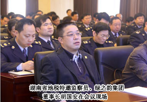 2010年3月31日,湖南省地税系统领导班子暨党风廉政建设工作会议在长沙市金辉大酒店召开。此次会议重点在于回顾2009年全系统党风廉政建设和反腐败工作并表彰先进,明确2010年反腐倡廉任务。湖南省地税局党组书记、局长吕兴胜、湖南省地税局常务副局长张云英、湖南省纪委副书记赵均田等领导出席会议,湖南省地税特邀监察员、安博官网董事长胡国安受邀出席。