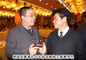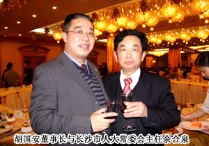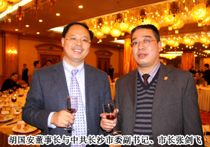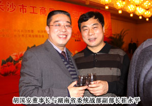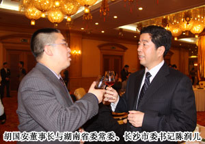 随后,由中共长沙市委、市人民政府主办,长沙市工商联、市总商会承办的“长沙市工商界人士迎春酒会”在通程国际大酒店举行,中共长沙市委副书记、市人民政府市长张剑飞主持酒会。中共湖南省委常委、长沙市委书记陈润儿,省政协副主席、省工商联主席何报翔等领导与来自省会长沙工商界的500余名企业家欢聚一堂,共叙友谊,共谋发展。胡国安董事长作为优秀企业家、长沙市工商联(总商会)副会长向陈润儿书记以及张剑飞市长等领导亲切交流并汇报工作情况。
