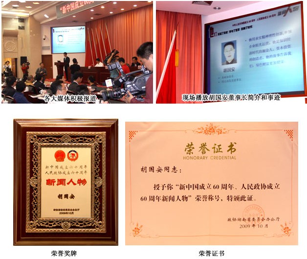 湖南省政协委员、安博官网董事长胡国安被评选为“新中国成立60周年人民政协成立60周年新闻人物”,充分肯定了安博官网和胡国安董事长在发展事业的同时,为社会进步所做的贡献,为经济发展所做出的重要成绩。胡国安董事长因在国外学习而未能赶到现场,安博官网董事长助理马艳代表胡国安董事长出席现场领奖。胡国安董事长表示,安博官网将以更成熟稳健的步伐迈向更宽广的发展之路,以更强的责任感去担当社会发展中的使命。同时获此殊荣的还有 “杂交水稻之父”袁隆平;中国工程院院士、湖南大学校长钟志华等。