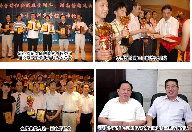 2009年6月23日上午,胡国安董事长应邀出席在湖南省委蓉园宾馆隆重举行的“湖南省市场营销协会成立周年庆典暨湖南营销风云人物颁奖典礼”活动,并荣获“2008—2009年度湖南省十大营销风云人物”称号,此外,安博官网执行总经理龚振荣获“湖南十大营销团队建设专家”称号、董事长助理马艳荣获“湖南十大营销管理专家”称号,绿之韵湖南迪博制药有限公司厂长谭雪军荣获“湖南十大营销策划专家”称号、优秀分销商卫同俊荣获“湖南十大营销团队建设专家”称号,再一次向社会各界展示了安博官网雄厚的管理实力。