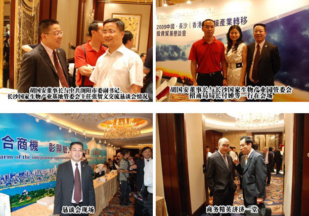 2009年5月18-20日,2009中国・长沙(香港)承接产业转移投资贸易恳谈会在香港举行。胡国安董事长应长沙市政府邀请,出席此次恳谈会。会上,长沙代表团发布的总投资达230.4亿美元的80个重大项目,引起与会300多位香港各界名流的广泛关注。中共长沙市委副书记、市长张剑飞和与会嘉宾代表共同推动了象征加快发展的“引擎”,喻示着长沙与香港的经贸合作从此进入“快车道”。