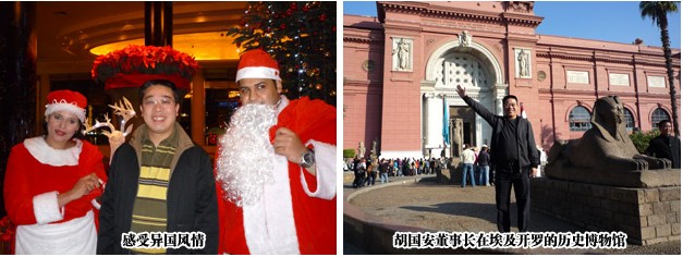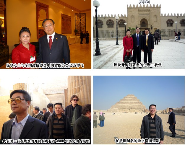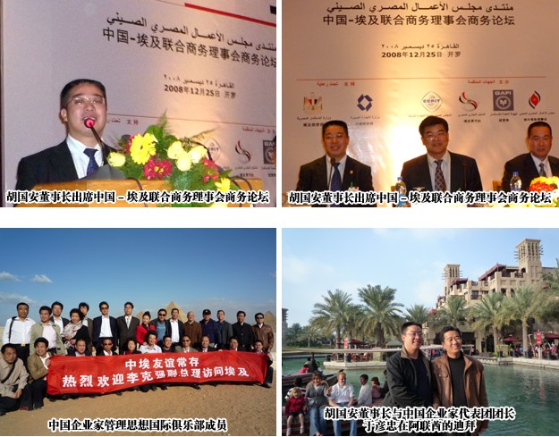 中国企业家管理思想国际俱乐部代表团,在团长于彦忠秘书长的率领下,经过六天,行程2万余公里,圆满结束了对埃及和阿联酋的访问,于2008年12月28日晚11点回到北京。开罗是埃及的首都,近年来经济发展迅速,蕴藏着无限商机。在此次的中埃联合商务理事论坛上,胡国安与埃方洽谈绿之韵在埃及的合作项目。
