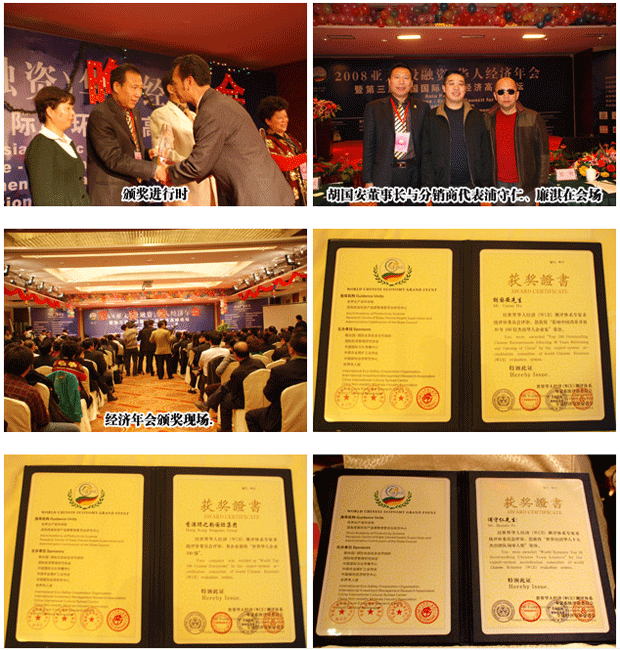 安博官网胡国安董事长受邀全程出席此次会议,安博官网荣获“世界华人企业500强”荣誉大奖,胡国安董事长个人被评为“影响中国改革开放30年100位杰出华人企业家”, 全国工商联副主席孙晓华为胡国安董事长颁奖; 绿之韵分销商管理委员会会长浦守仁获“2008年世界经济华人十大杰出团队领导人奖”。