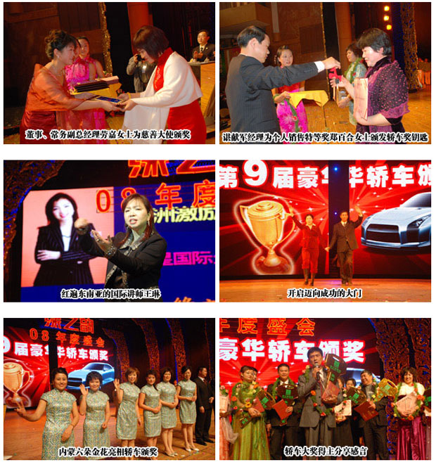 随着节目的层层推进,舞台电子屏幕播放了绿之韵形象店、历届拿车庆典的VCR,“2008年度个人零售业绩奖、2008年度店铺销售业绩前十名”颁奖典礼…………把现场气氛推向了高潮。年会颁奖典礼上最大的亮点是首次设置的钻石勋章奖,47位业绩骄人的分销精英获得了镌刻有自己名字,从两星至五星不等的纯金镶钻荣誉勋章。闪烁的灯光下,最激动人心的安博官网第九届豪华轿车大奖的得主依次登台领奖。年会上,红遍东南亚的金牌讲师、亚洲八大名师中唯一的女性讲师王琳在舞台上,为现场的绿之韵分销精英带来了一堂超越梦想的精彩演讲。王琳老师在台上挥洒自如的风采,妙语连珠的智慧和绘声绘声的演绎,让参会精英们在大开眼界的同时,更享受了一次全新的精神洗礼。