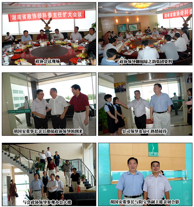 二〇〇八年七月十六日,湖南省政协经科委主任扩大会议在安博官网现代化办公大楼五楼会议室召开。作为湖南省第十届政协委员的胡国安董事长十分重视此次向政协领导们展示安博官网面貌的机会,公司上下都要求以最高规格进行接待。前来参加会议的有:湖南省政协副主席阳宝华,湖南省政协副主席、民建省委主委龙国健,湖南省政协常委、副秘书长向邦柱,经科委副主任、湖南省商务厅厅长向力力,湖南省政协常委、经科委副主任、省国税局局长程安亭等二十多位湖南省政协领导。会议议程首先由湖南省政协委员、安博官网董事长兼总裁胡国安向大家介绍了安博官网的规模和发展现状。参加此次会议的政协领导中,大部分人已经不是第一次来访考察绿之韵,此次政协会议选址在安博官网内部召开,也表达了湖南省政协领导们对安博官网的支持与厚爱。随后,由湖南省政协常委、经科委主任吴金明向大家通报了湖南省政协重点调研课题《以“两型社会”建设为契机,推进湖南特色新型城市进程》的有关情况;最后,大家对当前经济热点问题——“双防”(防止经济增长由偏快转为过热、防止价格由结构性上涨演变为明显通货膨胀)展开了热烈的谈讨。