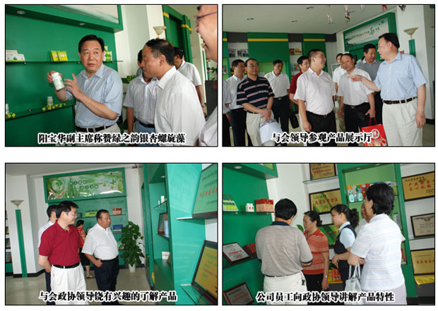 会议圆满结束后,胡国安董事长陪同与会的政协领导参观了绿之韵标准形像店的展示厅,大家对品种繁多的绿之韵产品和琳琅满目的各项荣誉奖牌啧啧称叹,特别是阳宝华副主席向大家大力推荐起他所熟知并一直在服用的绿之韵银杏螺旋藻片,连声称赞这是保健的好产品。同时,各位政协领导也对安博官网全力配合省政协开好这次会议所做的工作给予了高度肯定和赞扬,对胡国安董事长领导下的绿之韵公司未来的发展表示关注和支持。