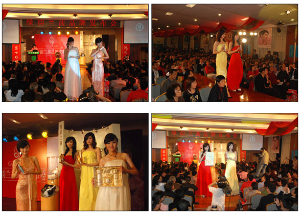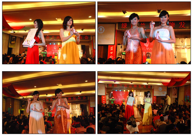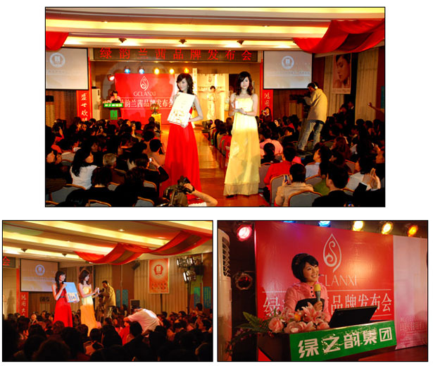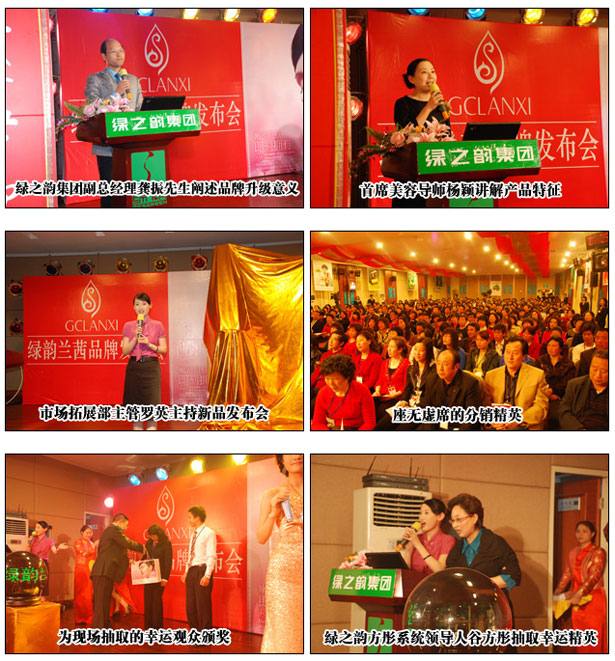 沿用四年的绿韵兰茜护肤品历经半年的精心筹略,全面系统的进行了产品定位、品牌VI设计、品牌宣传品设计等整体品牌形象更新,并聘请法国著名模特Amei担任品牌形象宣传,此次的全新闪亮登场给大家带来非常震撼的感觉。整场发布会安排有品牌揭幕、新品展示、幸运观众现场抽奖等环节,同时,集团公司还特意请到湖南卫视与湖南影视集团携手打造的国内一流电视购物频道“快乐购”的主持人及模特进行新装产品的现场讲解以及产品走秀。整场发布会为绿韵兰茜品牌注入了独具个性而又恰到好处的文化内涵,提升了品牌的文化价值。